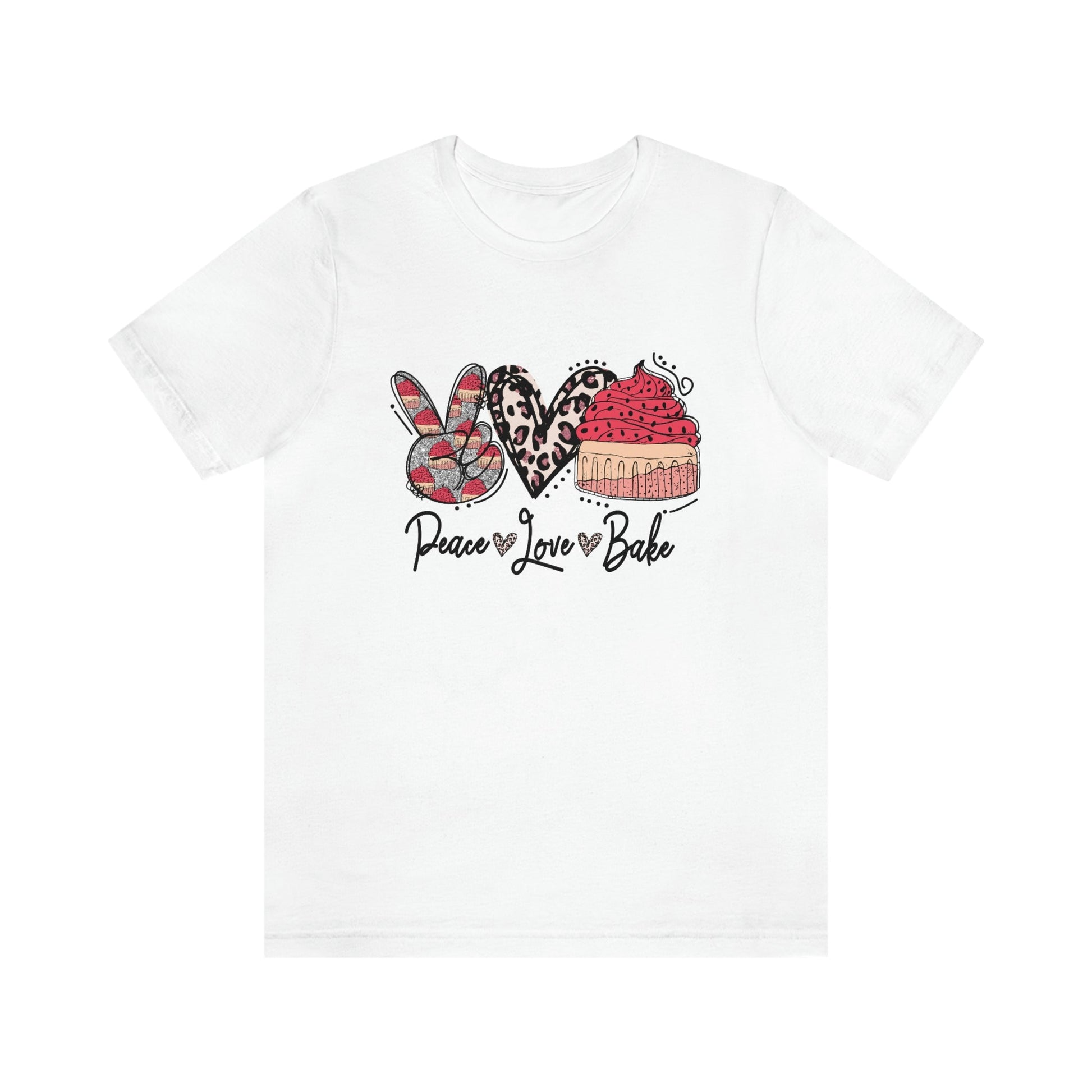 Peace, Love and Bake This classic unisex jersey short sleeve tee fits like a well-loved favorite. Soft cotton and quality print make users fall in love with it over and over again. These t-shirts have-ribbed knit collars to bolster shaping. The shoulders have taping for better fit over time. Dual side seams hold the garment's shape for longer.