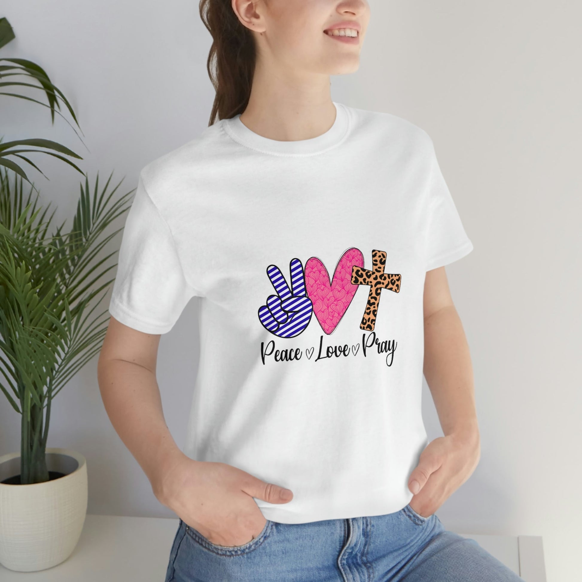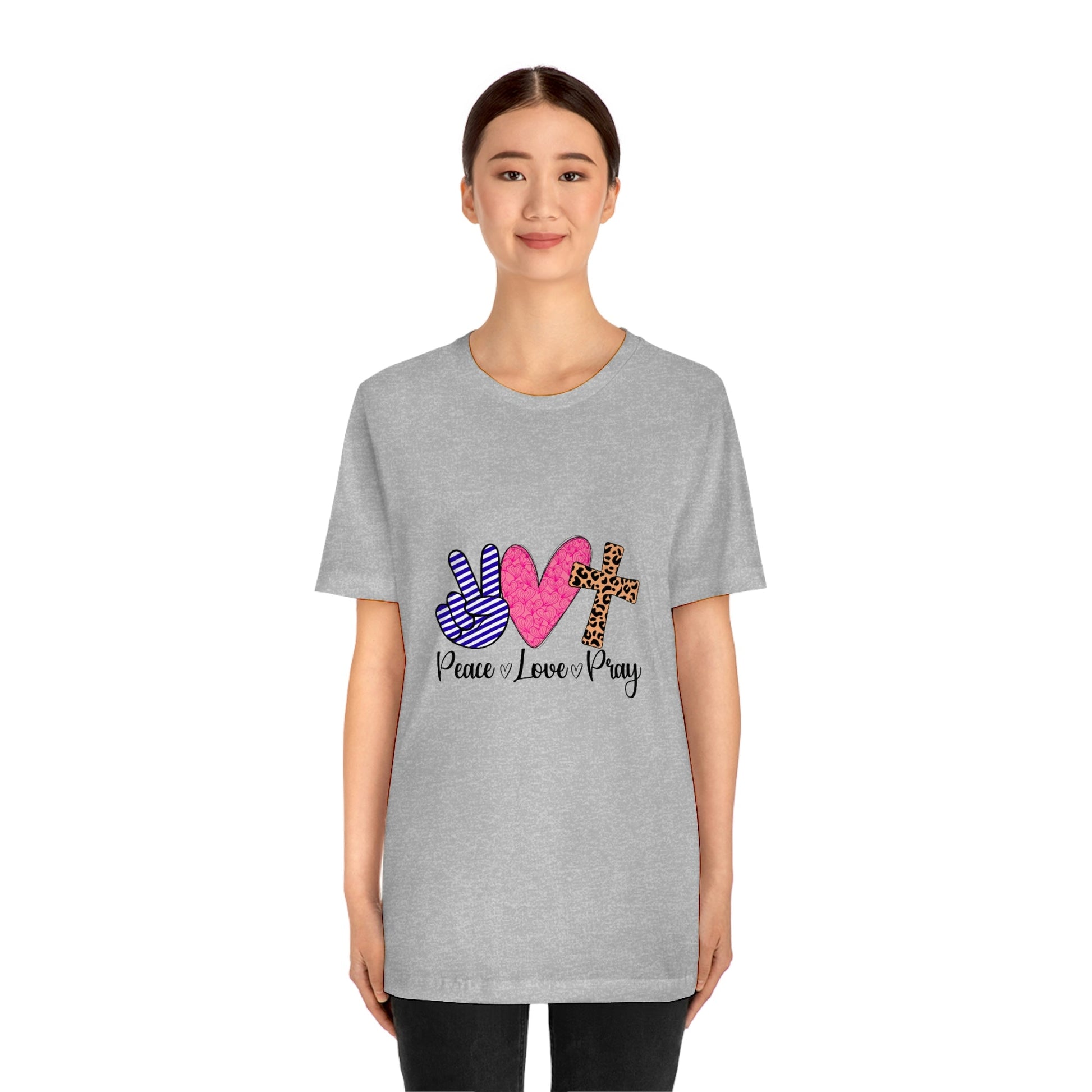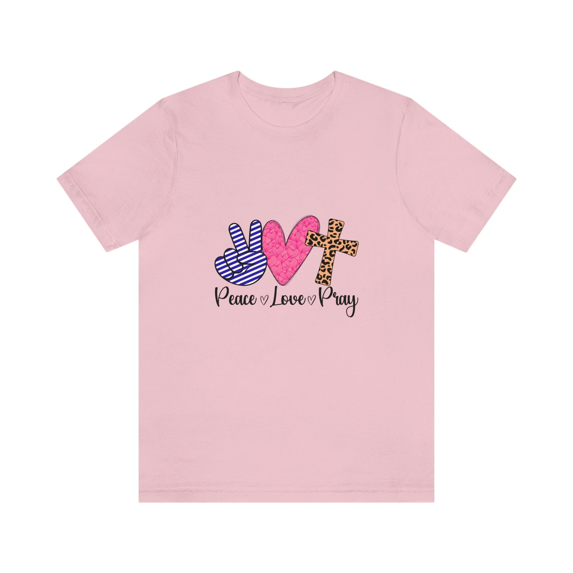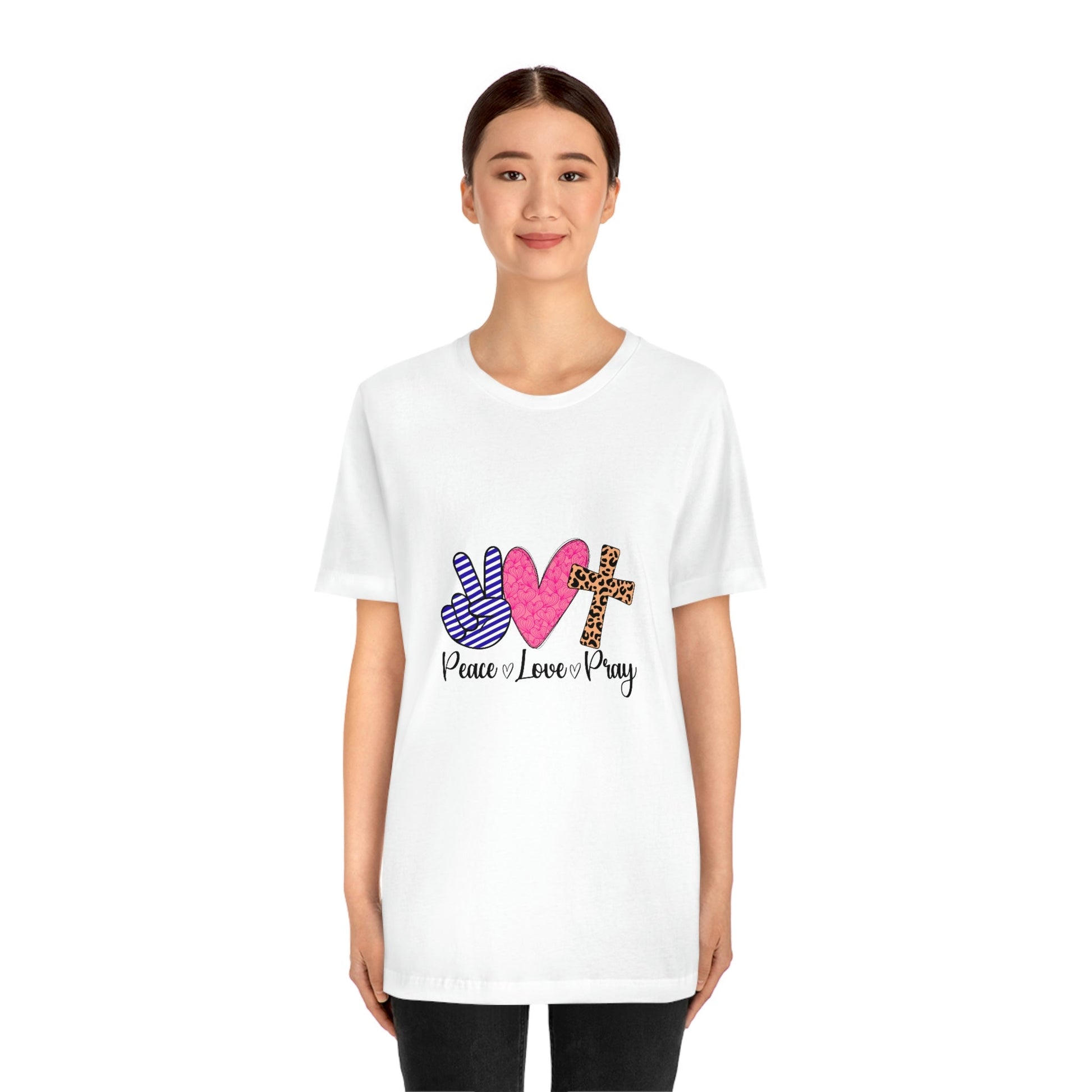Peace, Love and Pray This classic unisex jersey short sleeve tee fits like a well-loved favorite. Soft cotton and quality print make users fall in love with it over and over again. These t-shirts have-ribbed knit collars to bolster shaping. The shoulders have taping for better fit over time. Dual side seams hold the garment's shape for longer.