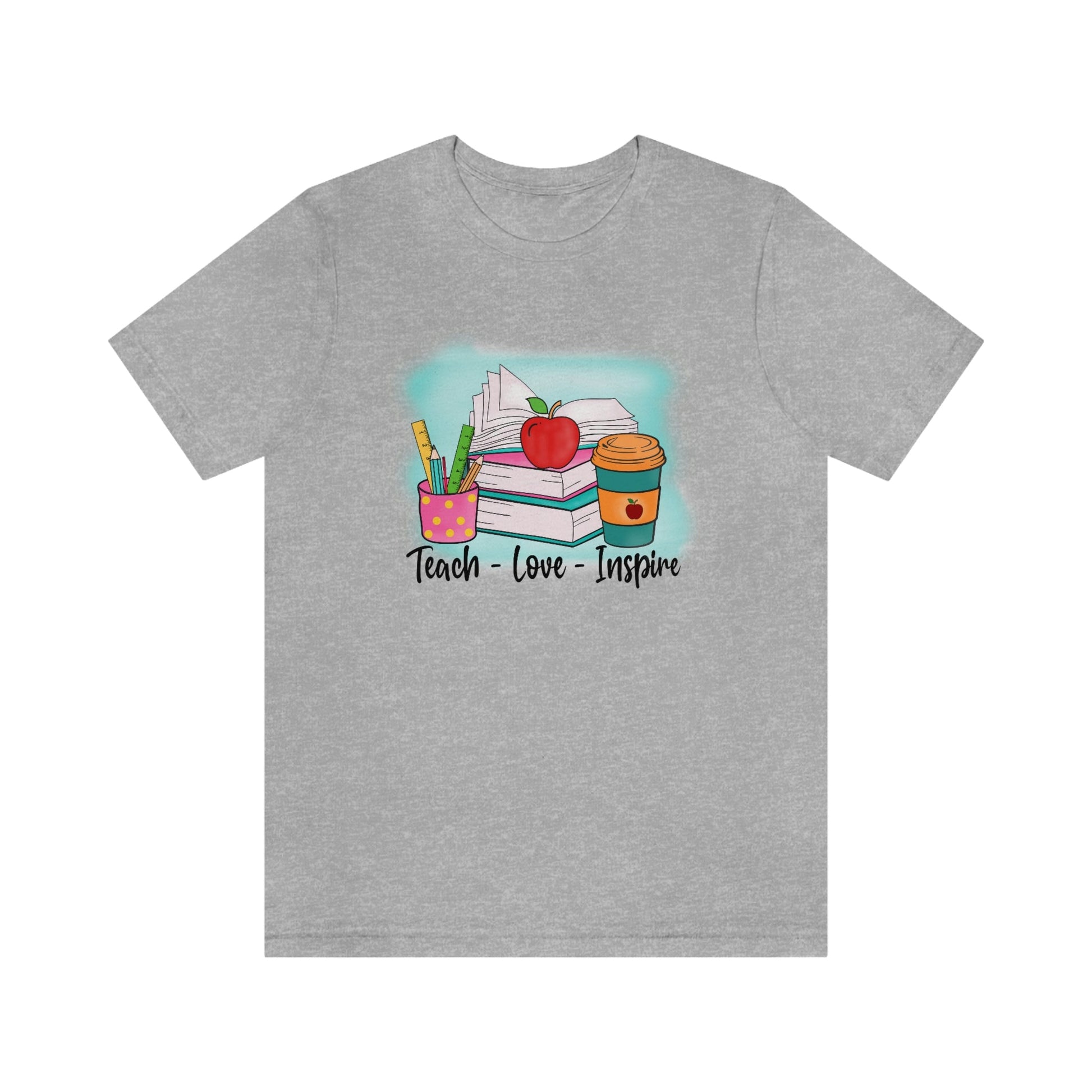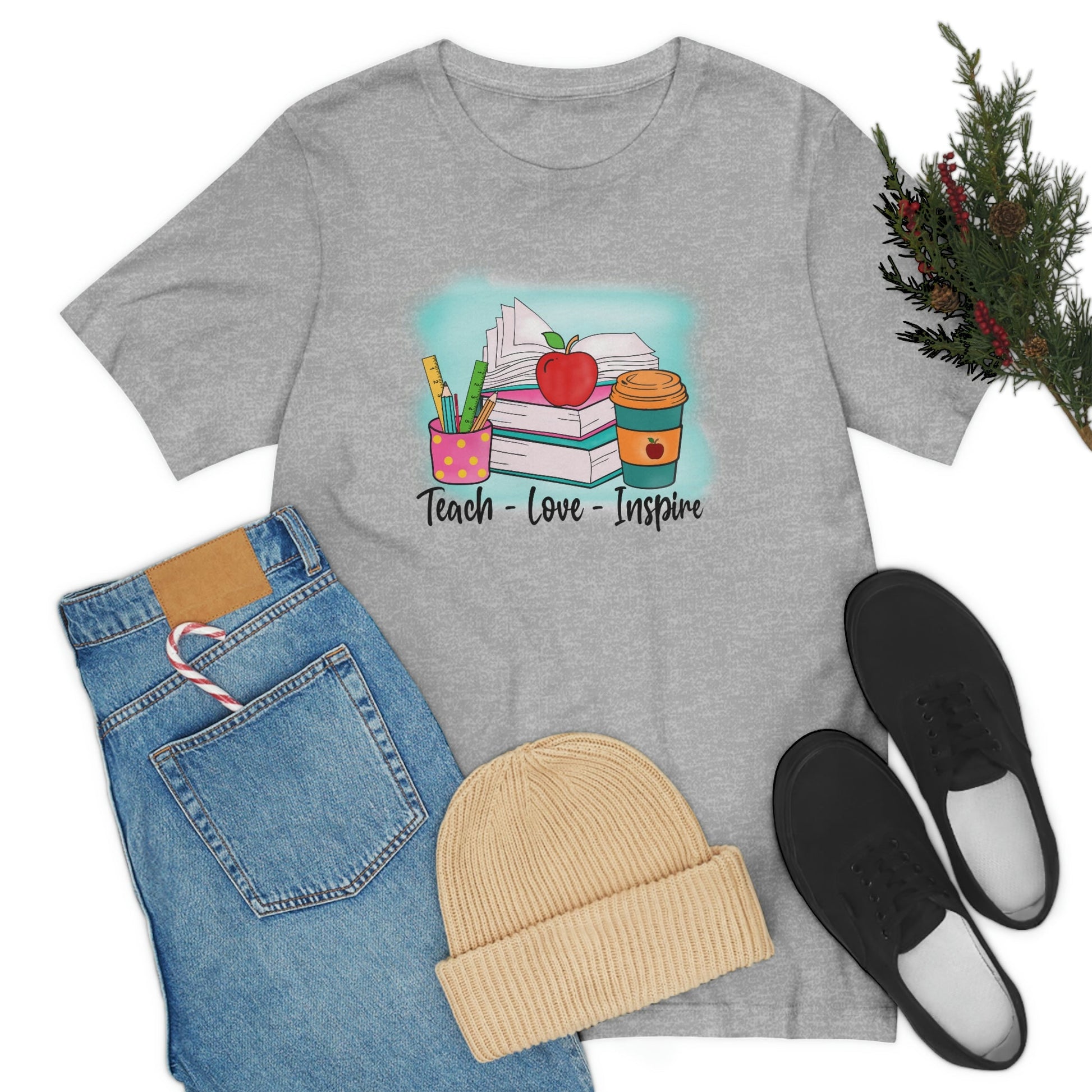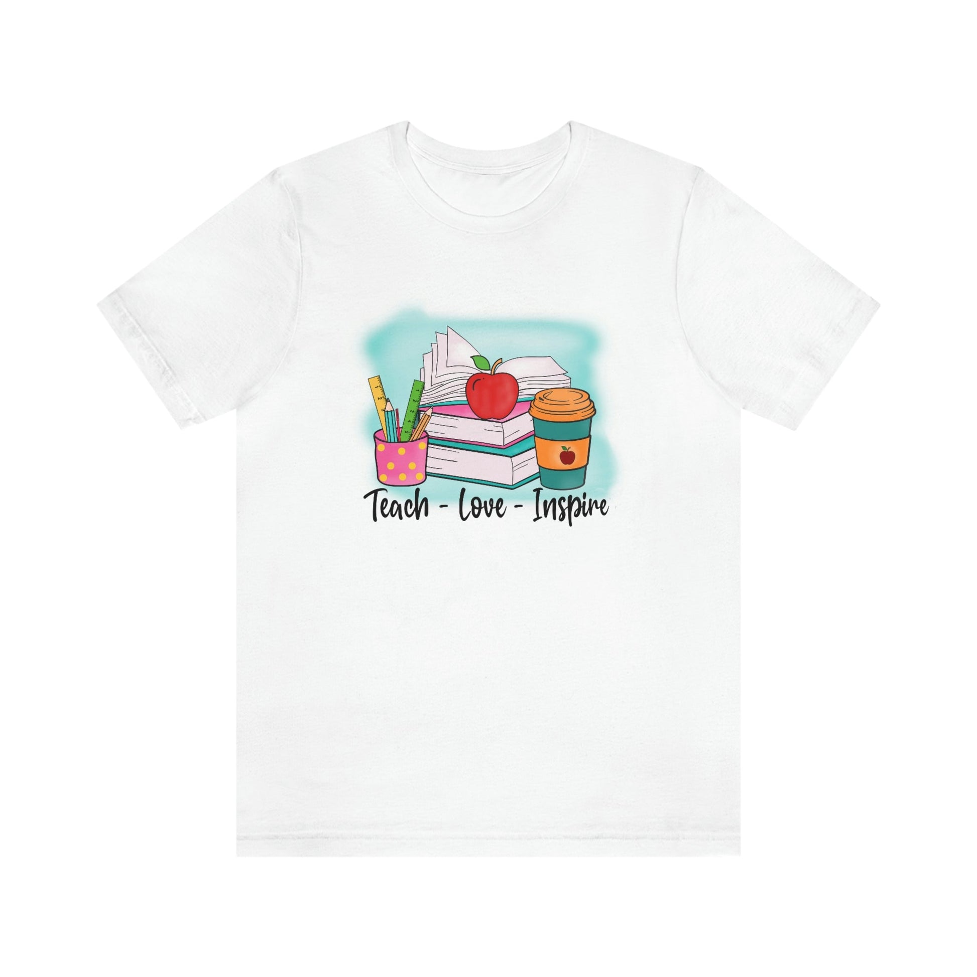 Teach, Love and Inspire This classic unisex jersey short sleeve tee fits like a well-loved favorite. Soft cotton and quality print make users fall in love with it over and over again. These t-shirts have-ribbed knit collars to bolster shaping. The shoulders have taping for better fit over time. Dual side seams hold the garment's shape for longer.